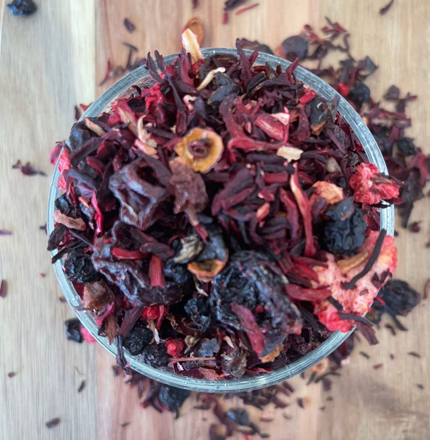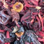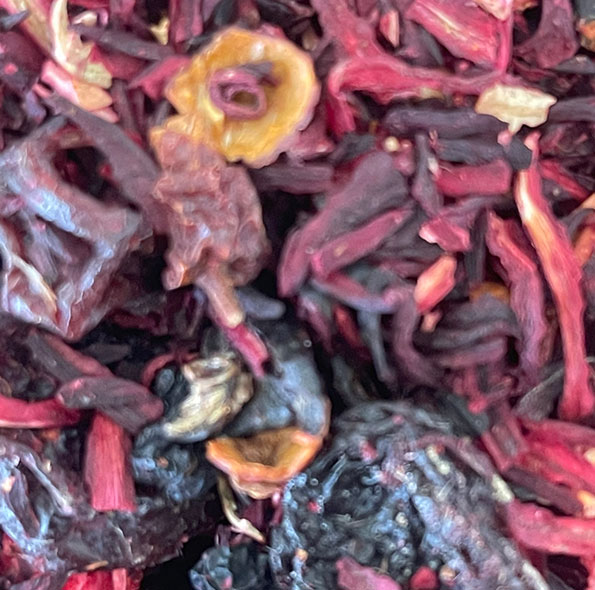 Składniki: Hibiskus, skórka róży, rodzynki (olej słonecznikowy), aronia, malina liofilizowana, truskawka liofilizowana, aromat (kompozycja owoców i malin).
