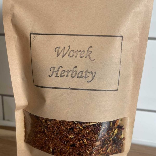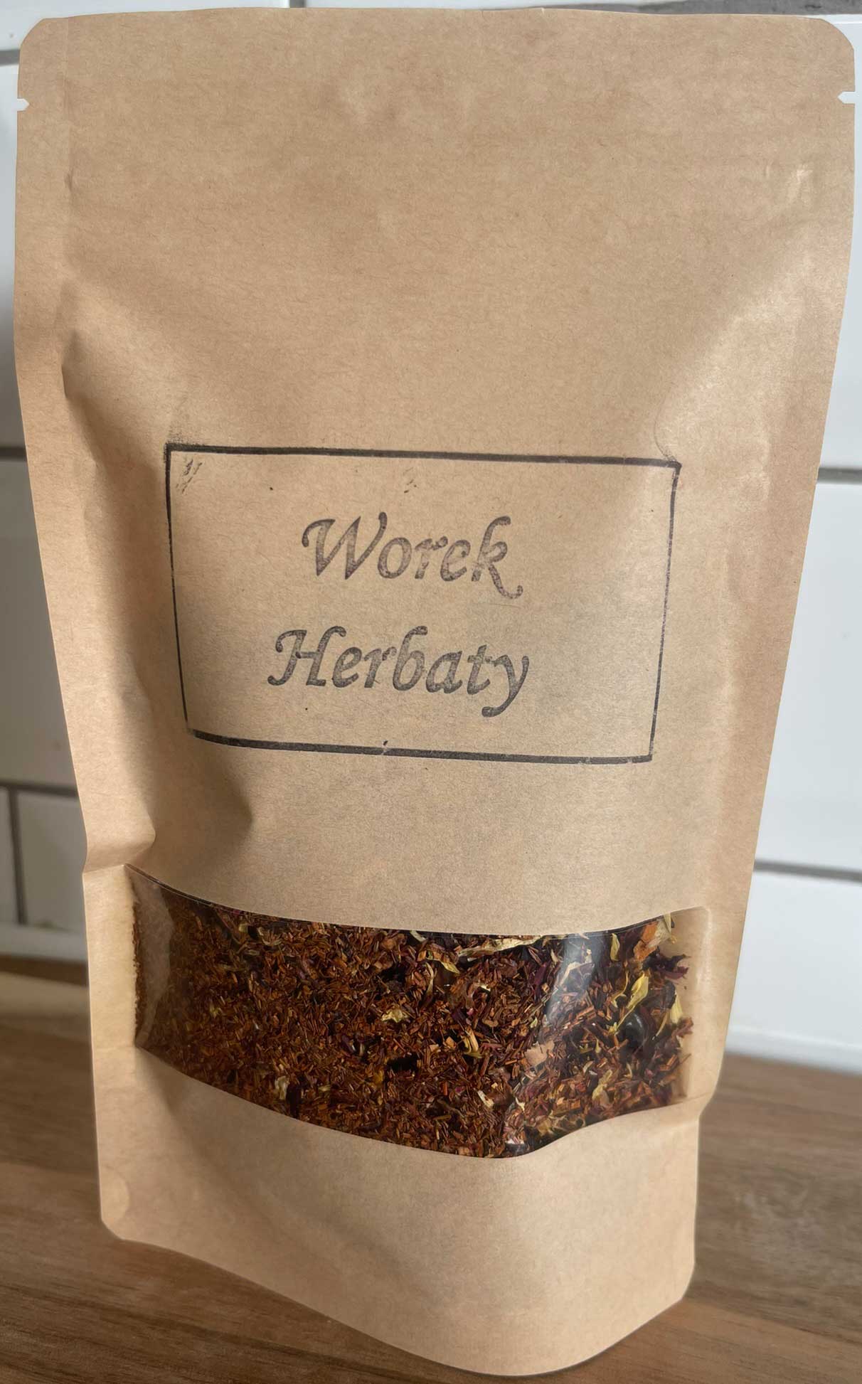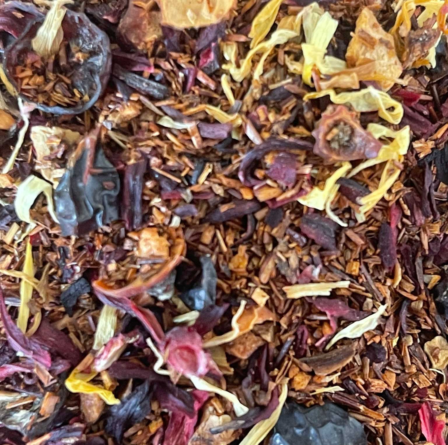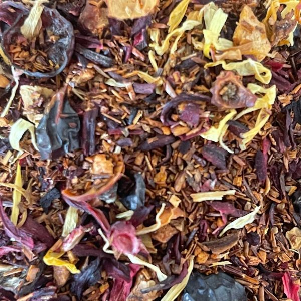 Pierwsze wrażenie to miękkość rooibosa — ciepła, miodowa, spokojna. Dopiero potem pojawiają się owoce, które nie dominują, lecz uzupełniają. To nie jest kontrast, to współpraca.