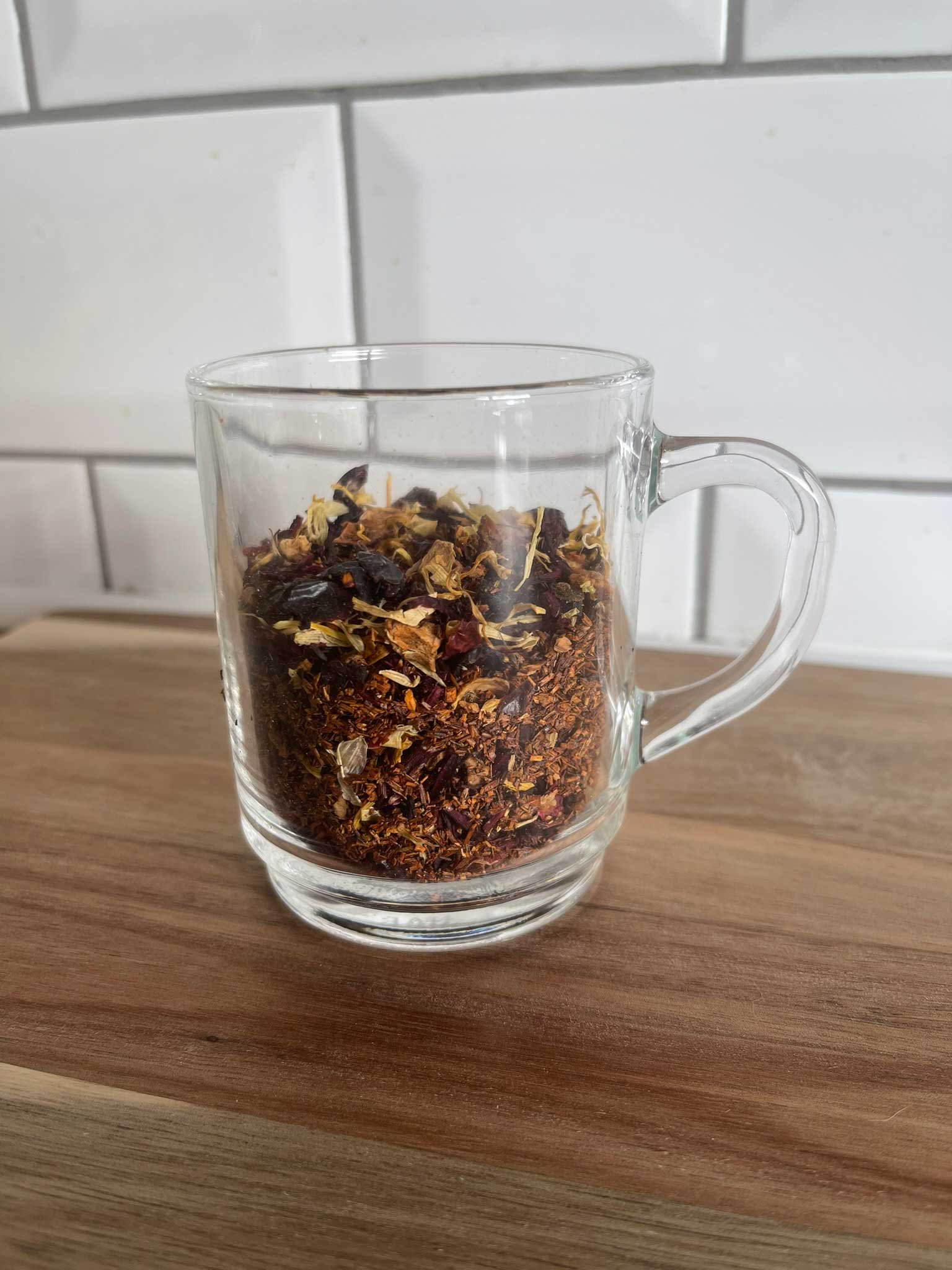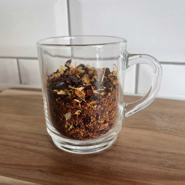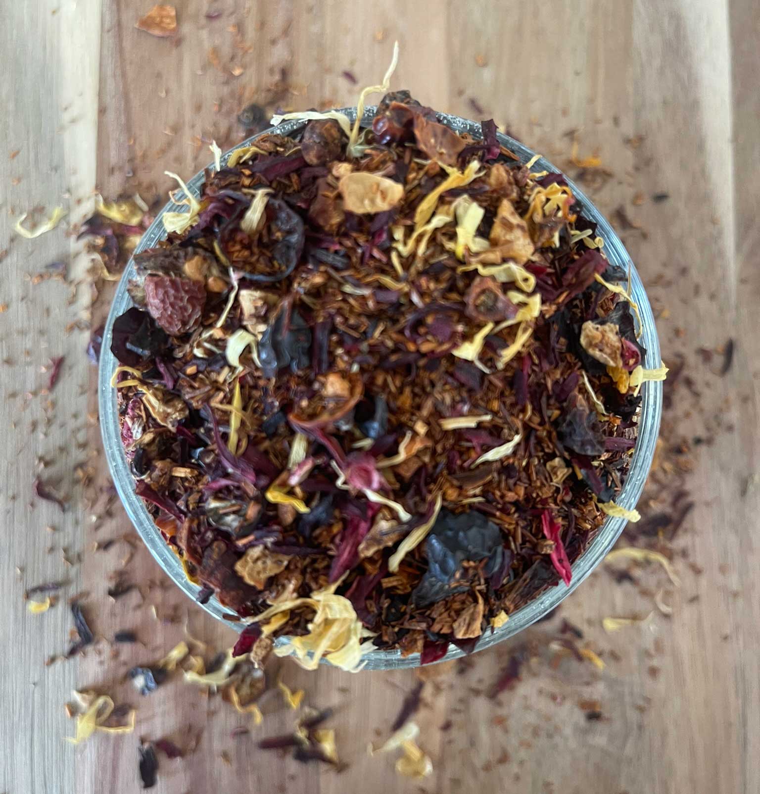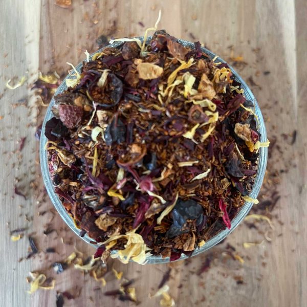 Pierwsze wrażenie to miękkość rooibosa — ciepła, miodowa, spokojna. Dopiero potem pojawiają się owoce, które nie dominują, lecz uzupełniają. To nie jest kontrast, to współpraca.